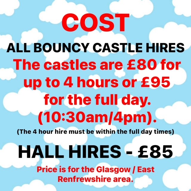 We are a Glasgow / East Renfrewshire bouncy castle and slide hire family run company. We supply quality Bouncy Castles and Bouncy Slides for Birthday Parties, Christenings, Holy Communions, Weddings, Bar Mitzvahs, Charity events, Fun Days and all other family occasions. We supply and set up all equipment in the Glasgow and East Renfrewshire area and can supervise the Bouncy Castle or Bouncy Slide to ensure everyone's safety. We are a friendly, safe and reliable company to use. Do not put your child's safety at risk! We hold full public liability insurance up to £5,000,000. All our Bouncy Castles and Giant Bouncy Slide equipment have current P.I.P.A safety certificates. All electrical equipment is P.A.T tested annually and all staff also have Enhanced Disclosure Scotland. If you need a friendly and professional Bouncy Castle service and live in Glasgow, East Renfrewshire or surrounding area's, then please give Kirkwoods Bouncy Castles a call!